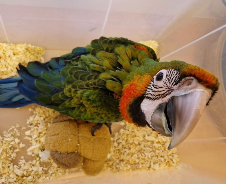 Chispa es una hembra de guacamayo Catalina de 3 meses, nacida en nuestro criadero. Es un híbrido de primera generación con una genética excepcional. Ha sido criada a mano exclusivamente, sin intervención de los padres, lo que la hace extremadamente confiada. Está en proceso de destete, tomando papilla dos veces al día y picoteando sólidos. Responde a su nombre, se sube al dedo y se deja coger sin miedo. Se está habituando a la manipulación de alas y patas. Su plumaje juvenil muestra ya los colores anaranjados característicos. Su peso es de 370 g, óptimo. Vacunada y desparasitada. Microchip implantado.