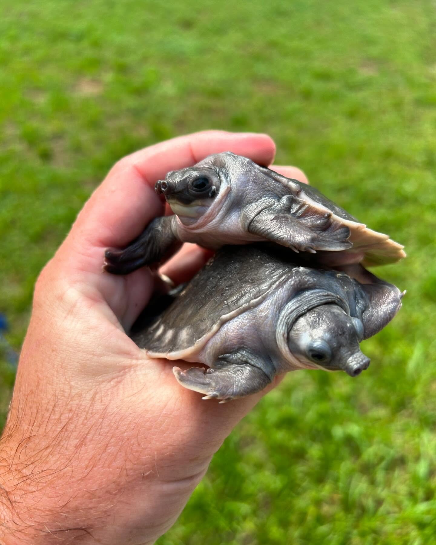 La Fly River Turtle es una especie extraordinaria, la única representante viva de su familia (Carettochelyidae). Su nombre común hace referencia al río Fly de Papúa Nueva Guinea, aunque también habita en el norte de Australia. Es una tortuga de caparazón blando, con aletas adaptadas a la natación rápida y una trompa característica que utiliza como esnórquel. Este ejemplar juvenil de unos 6 meses tiene un caparazón de unos 8 cm, de color gris oliva con bordes más claros, y muestra un comportamiento muy activo, nadando constantemente y explorando.