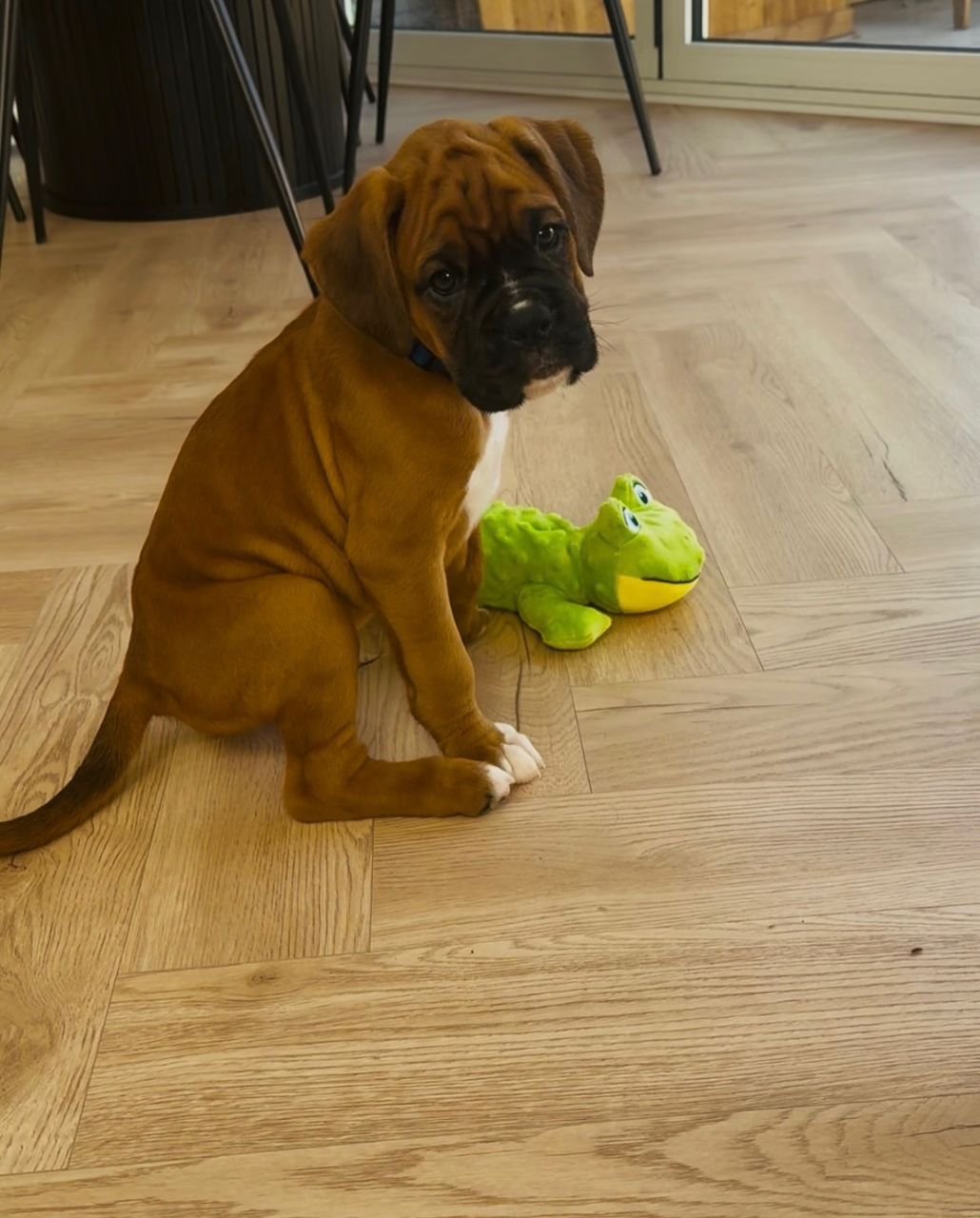 Desde el punto de vista sanitario, Gaga cuenta con todas las garantías. Sus padres han sido examinados mediante pruebas genéticas que descartan displasia de cadera y codo, problemas cardíacos (estenosis aórtica, cardiomiopatía) y otras patologías hereditarias comunes en la raza. Nuestro equipo veterinario ha supervisado su crecimiento, asegurando un desarrollo muscular óptimo y prestando especial atención a su estructura. Se entrega con cartilla, microchip, vacunas al día y desparasitaciones internas/externas. Además, incluimos un contrato de cesión responsable que detalla el acompañamiento postventa y la disponibilidad permanente de asesoramiento, con recomendaciones específicas para la alimentación y el ejercicio de un Bóxer.