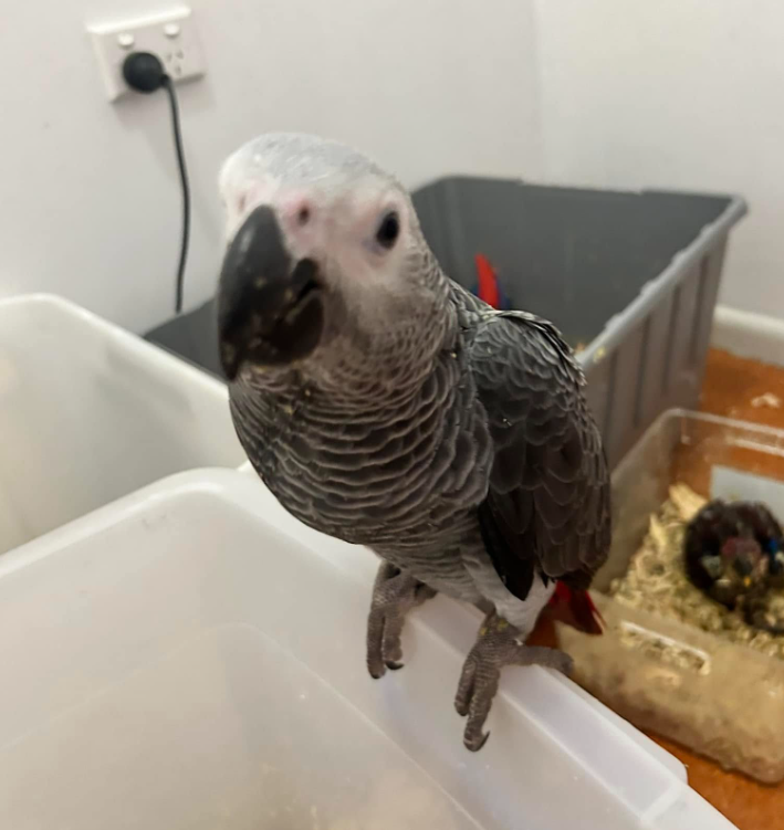 Comportamiento y entrenamiento: Rio es un loro extremadamente activo. Pasa gran parte del día explorando su jaula, jugando con cuerdas y mordiendo juguetes de madera. Ya ha aprendido a subirse a la mano con la orden «¡arriba!» y a regresar a su jaula con «¡casa!». Su capacidad de imitación es notable; además de las palabras mencionadas, intenta copiar el sonido del microondas y el ladrido de un perro. Es importante proporcionarle al menos 2-3 horas diarias de interacción y juego fuera de la jaula para evitar el aburrimiento.