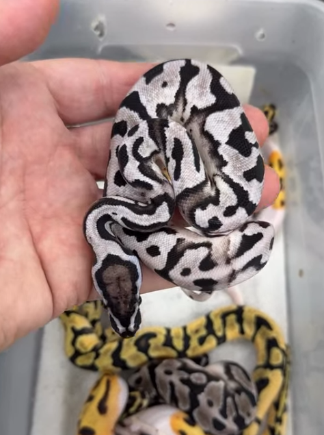 Este ejemplar proviene de un cruce entre GCR Axanthic Pied y OD Firefly, portando genes de gran interés para criadores. El Axanthic elimina los pigmentos rojos y amarillos, dejando una serpiente en tonos grises, negros y blancos. La piedad añade grandes manchas blancas, creando un contraste muy atractivo. Además, es portador (DH) de OD Firefly, lo que abre posibilidades para futuras crías.