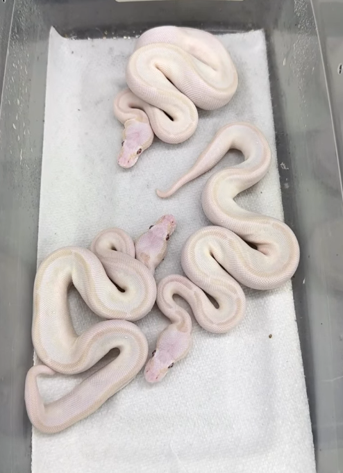 Esta pitón real es el resultado de combinar los genes Lavender (que produce tonos púrpuras), Butter (una forma de albinismo que da colores crema y amarillo), y Mystic (que aclara el patrón y puede producir ojos rojos). El ejemplar presenta una base de color lavanda pálido con sutiles tonos crema y un patrón casi inexistente, y sus ojos son de un rojo intenso, muy atractivo.