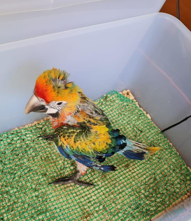 Su entrenamiento está en fase inicial pero muy prometedora. Responde a su nombre, se sube al dedo con la orden «¡arriba!» y se deja coger sin resistencia. Se está habituando a la manipulación de alas, patas y pico para futuras visitas veterinarias. También se le expone a diferentes entornos (interior y exterior controlado) para evitar miedos. Aunque aún no habla, emite gorjeos suaves y balbuceos. Su dieta actual es papilla tres veces al día, más trocitos de fruta blanda. Su peso y desarrollo son óptimos.