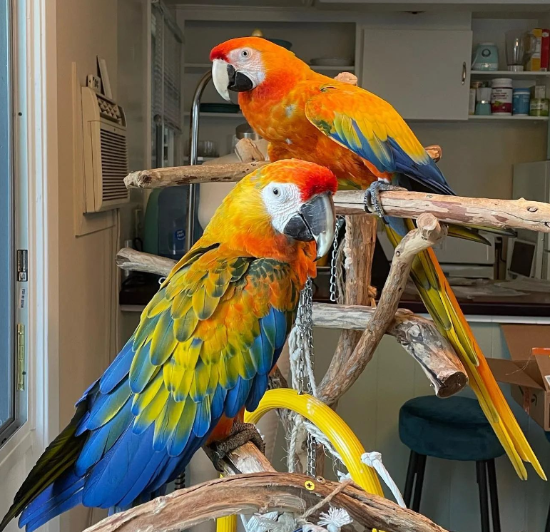 Tico es un macho de guacamayo Catalina que acaba de cumplir un año. Su plumaje es una explosión de colores: cabeza roja, pecho naranja intenso, alas con mezcla de amarillo y azul. Ha sido criado en un entorno doméstico enriquecido, con entrenamiento diario. Su repertorio de palabras incluye: «hola», «Tico», «¿qué tal?», «¡vamos!», «guau guau», «ring ring», «¡qué rico!», «adiós», «te quiero», «a dormir» y «beso». También imita risas, ladridos y silbidos de canciones.