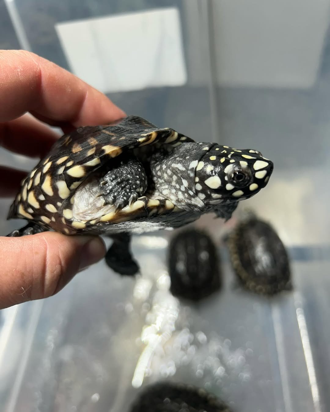 Ejemplar juvenil de tortuga manchada india (Geoclemys hamiltoni), conocida por su caparazón con manchas amarillas sobre fondo oscuro. 🐢 Es un año robusto (“chunky yearling”), con gran vitalidad y un temperamento activo. Es una especie semiacuática que requiere acuaterrario. Ideal para aficionados experimentados. Llega con toda su documentación. 🌊